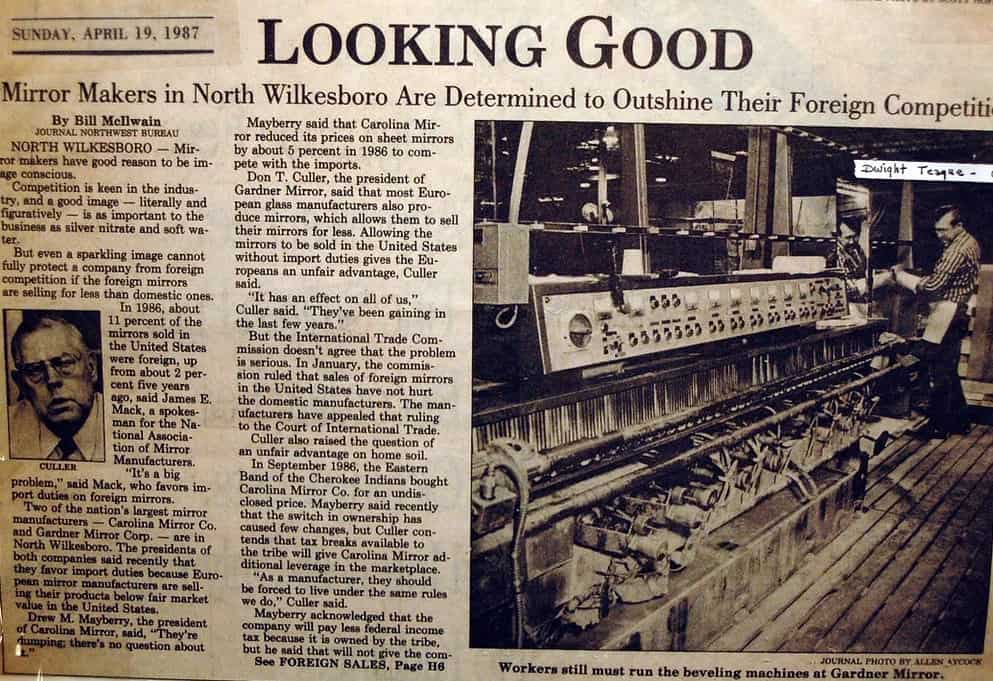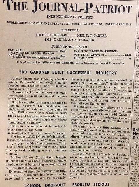 The most notable impact of Mr. Gardner’s career before 1962 was his tenure with Carolina Mirror Corporation, also based in North Wilkesboro, North Carolina. Edd Gardner founded Carolina Mirror Corporation in 1936. He remained President of Carolina Mirror until his departure in 1961.