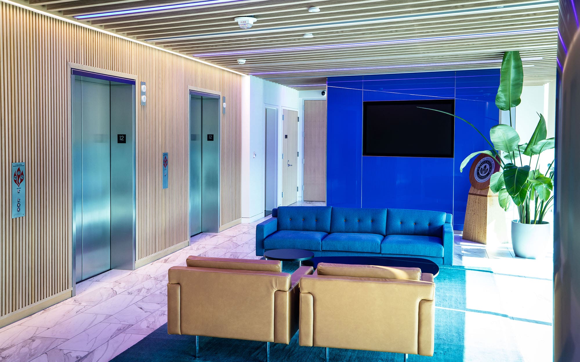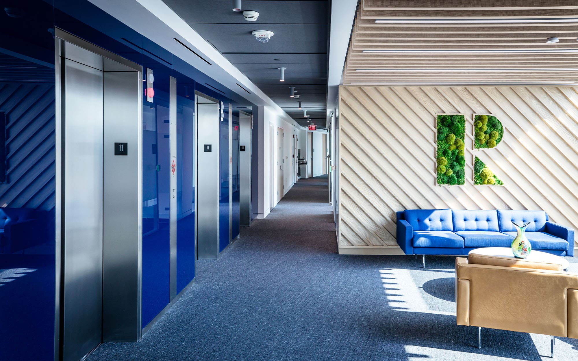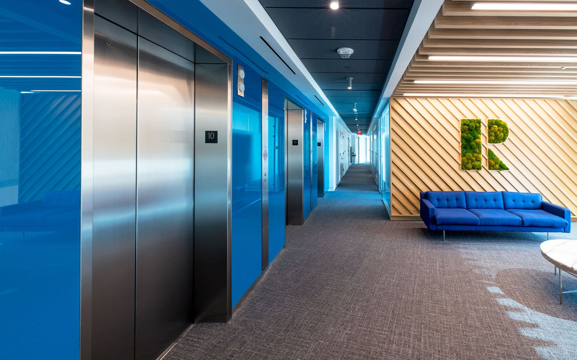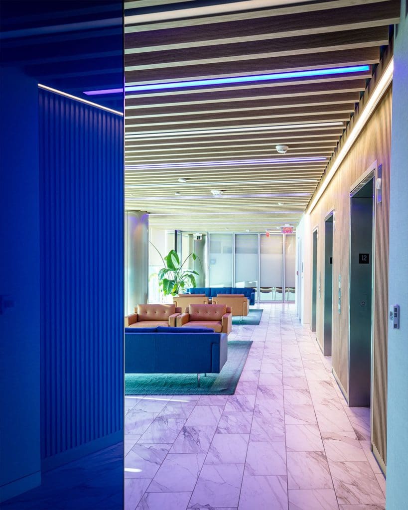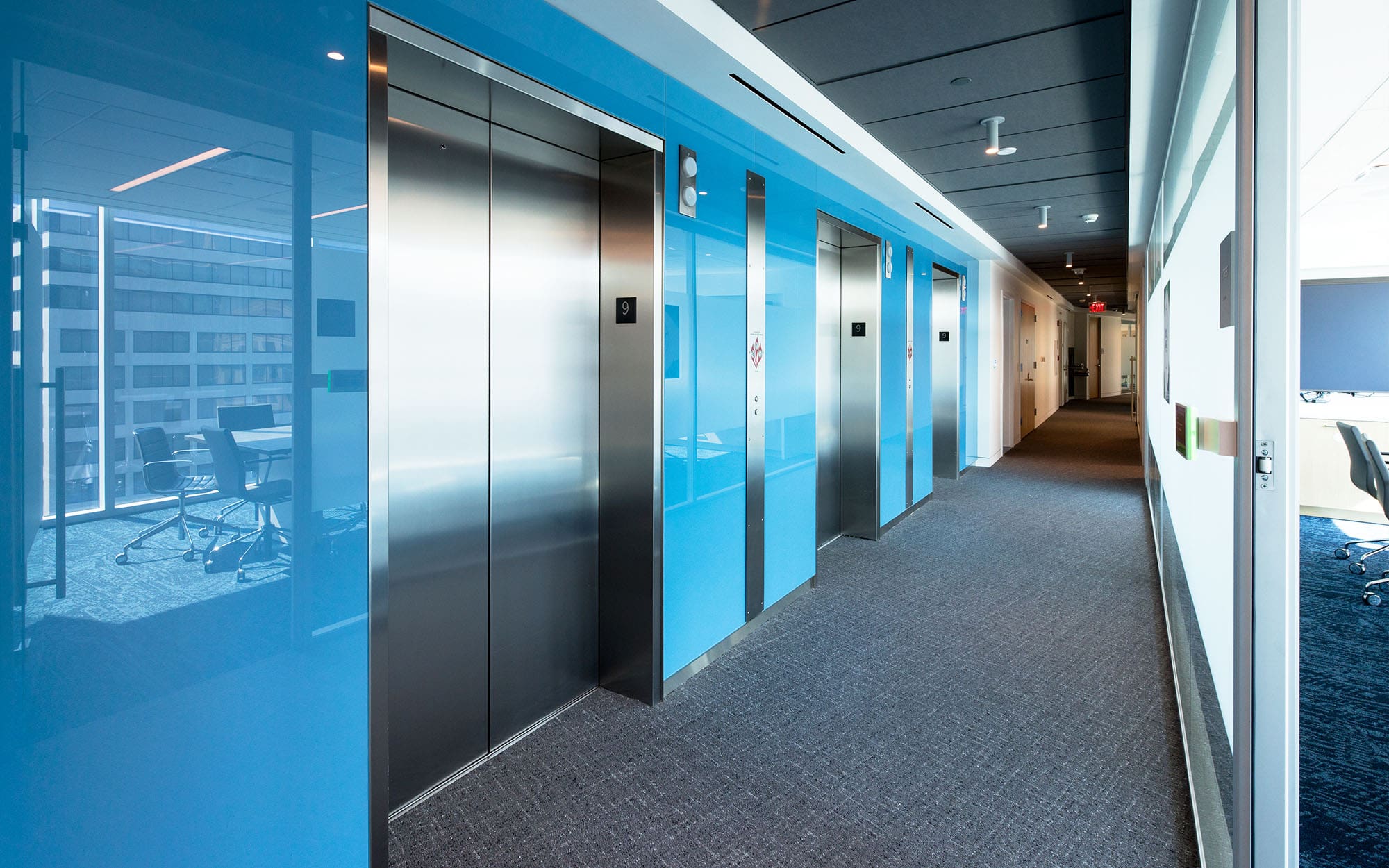 They chose a different shade of blue for each floor, starting at a darker blue for the top level, and getting progressively lighter for each lower floor to imitate the shades of blue in the sky. Pretty cool!