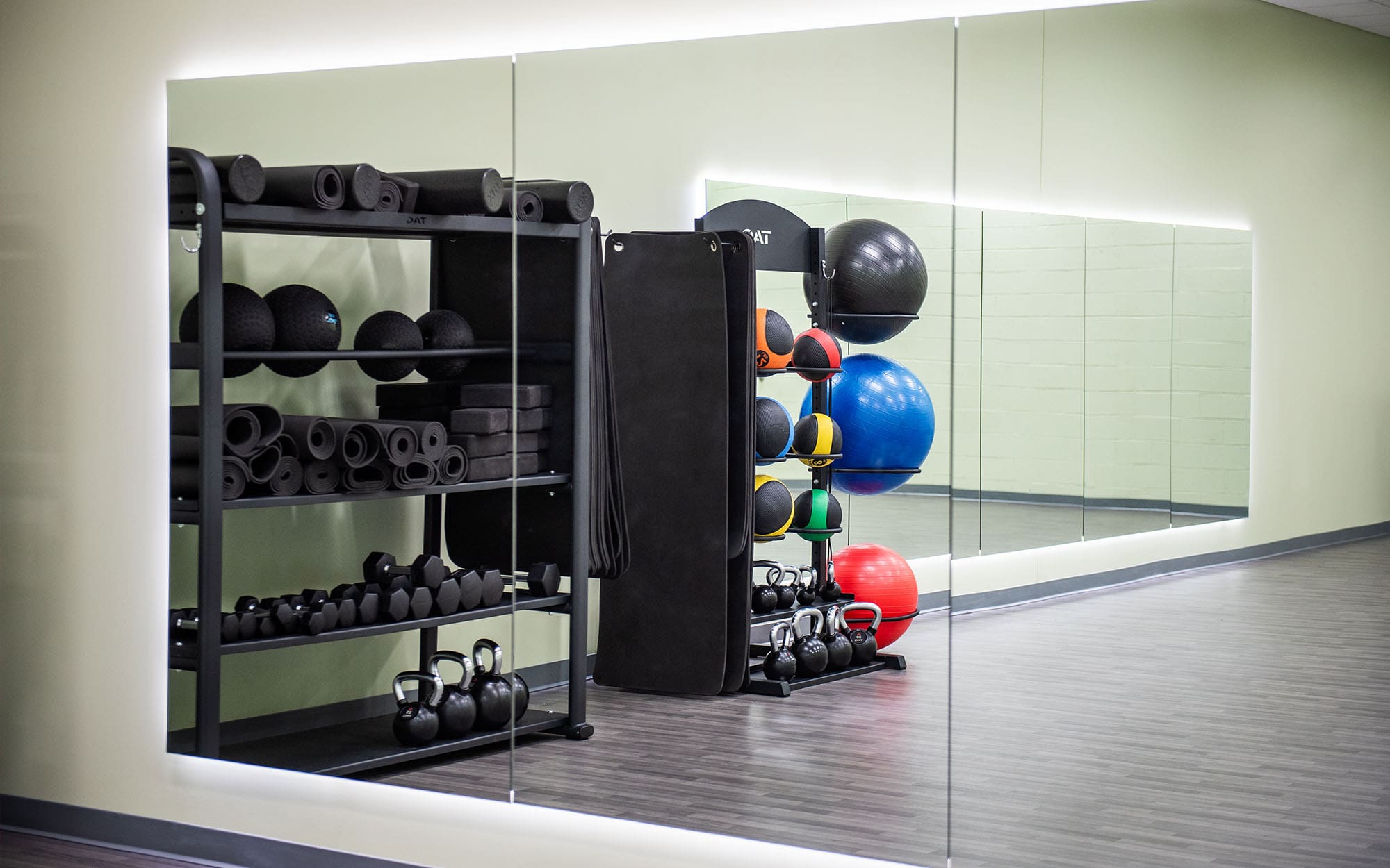 Sheetz Distribution in Burlington, NC got some beautiful Dreamwalls tempered mirrors for their Shwellness Center, their employee gym and fitness rooms. The designers did a fantastic job making these mirrors pop by using bold contrasting orange walls and backlighting. Nice work! Installed by Carolina Classic Window & Glass